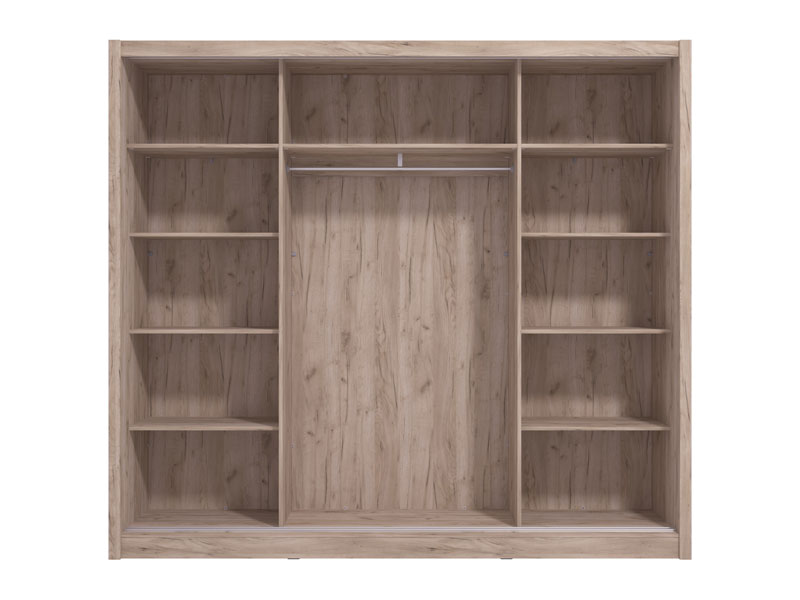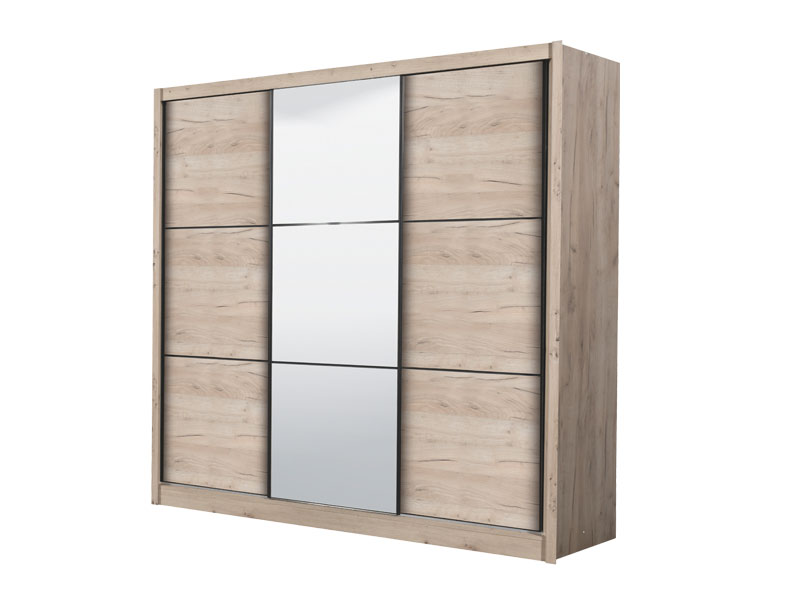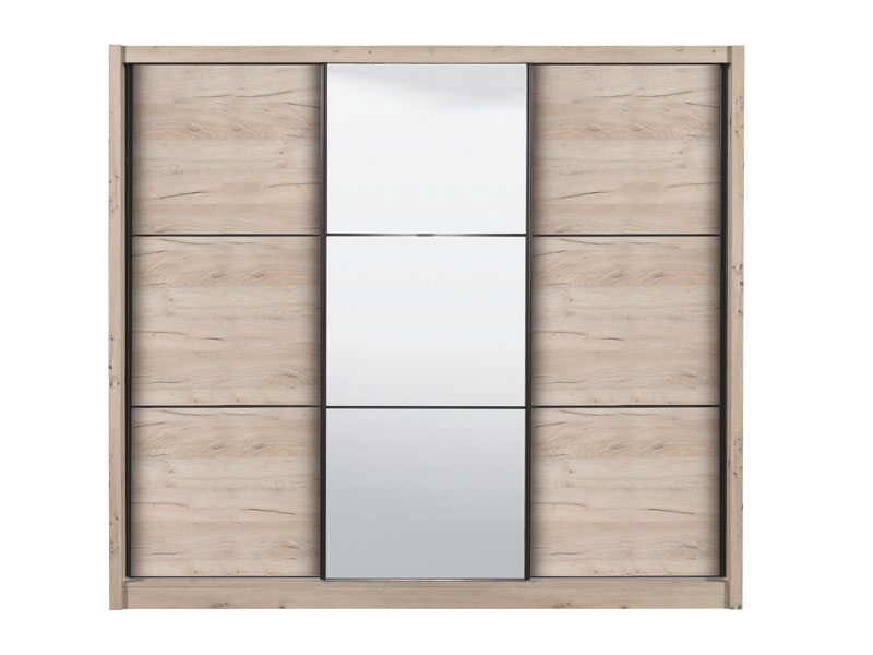 Garderober NAVARA 245 OG u dezenu artisan hrasta je moderno dizajnirano i praktično rješenje za odlaganje. Unutrašnjost se sastoji od segmenta sa policama u lijevom i desnom dijelu, kao i segmenta sa garderobnom šipkom u središnjem dijelu. Poseban benefit ovog modela je klizni mehanizam koji doprinosi ekonomičnoj organizaciji raspoloživog prostora, kao i ogledala smještenog na centralnom dijelu garderobera. Dio je linije NAVARA garderobera, tako da je stilski uklopiv i sa ostalim modelima.