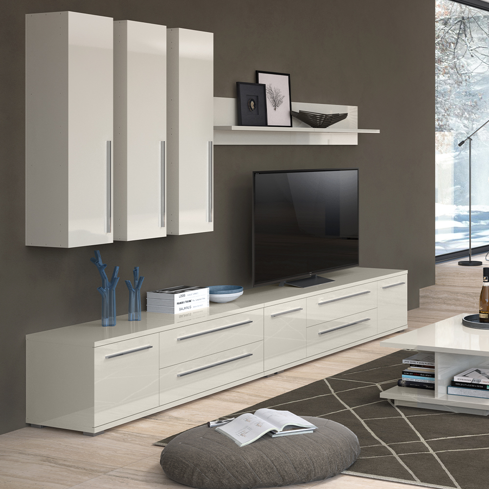 Tv sto za dnevnu sobu iz kolekcije nameštaja PIANO sa jednim krilom (60 cm) i dve fioke (90cm), kompletno lakiran najnovijom tehnologijom UV lakiranja frontovi, bočne strane i plafon elementa lakirani su UV lakom u visokom sjaju, u toploj bež ili kristalno beloj boji unutrašnji delovi korpusa su u beloj boji soft-close šarke i klizači omogućuju tiho zatvaranje krila i fioka, što pruža dodatnu ugodnost pri stalnoj upotrebi Moderan, eleganan i pre svega funkcionalan tv sto za dnevnu sobu.