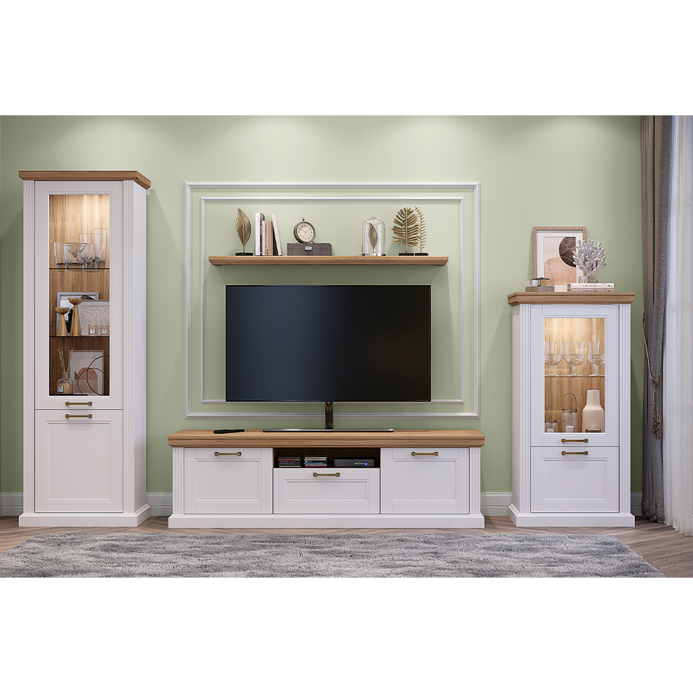 TV sto za dnevni boravak iz kolekcije Tara sa dva krila, fiokom i otvorenom policom. front je od rezbarenog medijapana lakiranog UV lakom sa soft mat efektom u grafit ili beloj boji korpus elementa je od univera u dekoru Pacifik orah, sa vidne strane lakiran UV lakom sa soft mat efektom u grafit ili beloj boji stilski profilisane lajsne izrađene su od medijapana debljine 25 mm unutrašnjost fioke je u dekoru tekstila TV sto ima soft-close klizače za tiho i elegantno zatvaranje podesive nožice za nivelisanje na neravnim površinama, kao i dekorativne ručice (R-30), uračunate su u cenu elementa