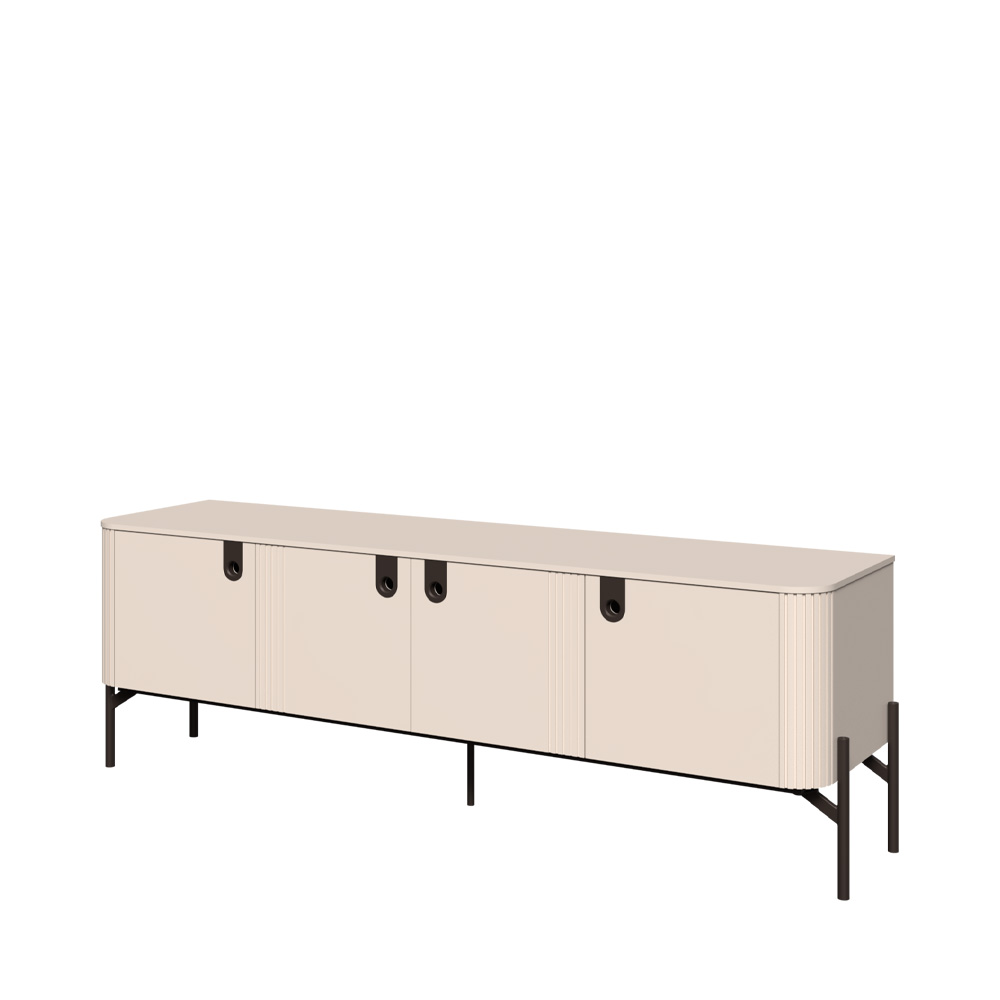 TV sto za dnevnu sobu iz kolekcije RONDO sa četiri krila. četiri krila, frontovi lakirani UV lakom u dekoru Kašmir mat unutrašnjost elementa u dekoru Textil duplo ojačan plafon elementa od univera, u dekoru Kašmir mat UV lak bočne strane i pod od univera, u dekoru Kašmir mat UV lak dekorativne reljefne lajsne od MDF-a metalne ručice u dekoru Midnight Copper metalne nožice u dekoru Midnight Copper metalni ram kao osnova elementa soft-close šarke