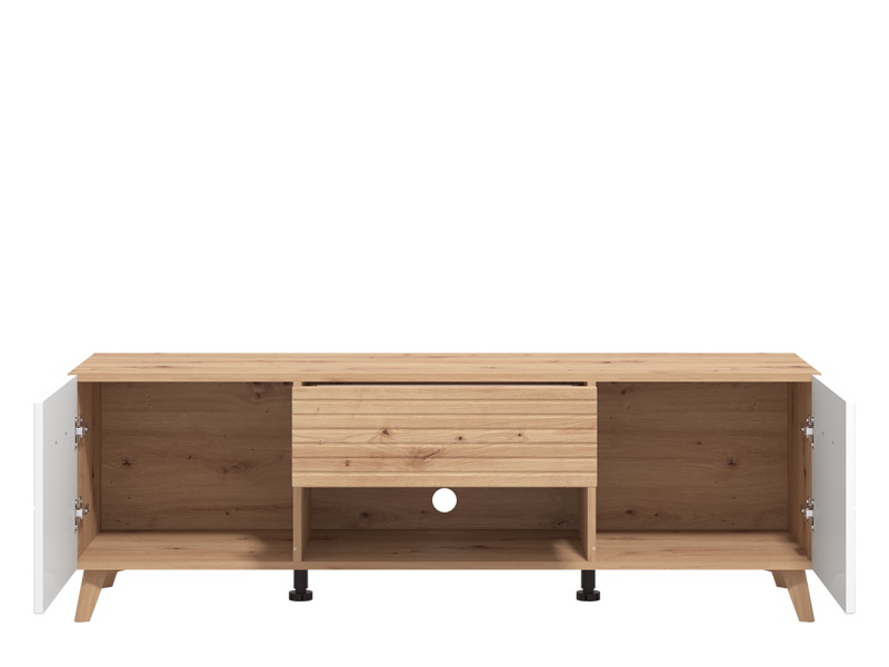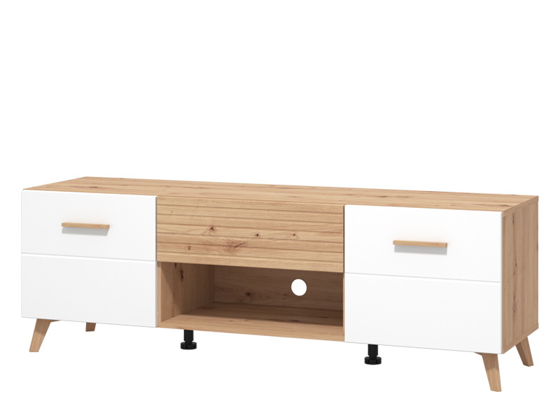 TV polica BRETAGNA TV 150 izrađena je u kombinaciji dekora artisan hrasta sa segmentima u dekoru bele lak folije, kao i artisan hrast folije, koji unose osvežavajuću estetiku u ambijent. Drvene ručice povezuju dekore u jednu estetsku celinu, dok visoki nogari ističu njihovu eleganciju. Dva bočna zatvorena segmenta, praktična fioka, kao i otvorena polica, efektno doprinose funkcionalnoj organizaciji dnevnog boravka. Deo je istoimenog sistema elemenata za uređenje ambijenta dnevnog boravka, koje odlikuju karakteristike modernog dizajna ujedinjene sa prefinjenom notom elegancije.