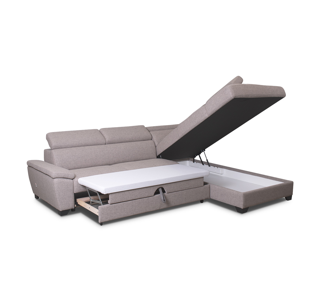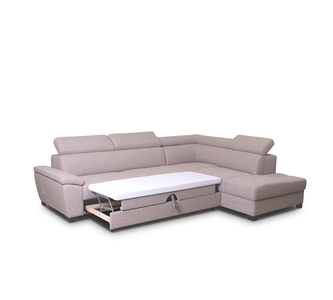 Berta, ugaona garnitura sa podesivim naslonima za glavu, pomoćnim ležajem i box-om. Mehanizam za spavanje, prostor za odlaganje.